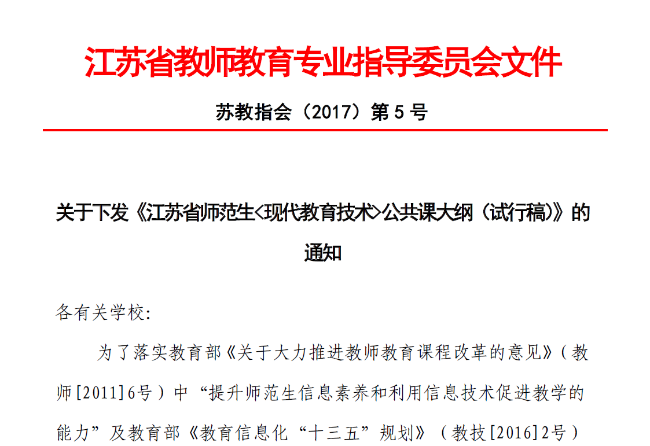 日前,受江苏省教育厅委托由BV伟德官方网站教育信息化研究中心主任陈明选教授领衔研制的《江苏省师范生<现代教育技术>公共课大纲(试行稿)》(以下简称《大纲》),经江苏省教师教育专业指导委员会审定,正式公布下发有关高校执行。 为了落实教育部《关于大力推进教师教育课程改革的意见》(教师[2011]6号)中“提升师范生信息素养和利用信息技术促进教学的能力”及教育部《教育信息化“十三五”规划》(教技[2016]2号)中“将信息...