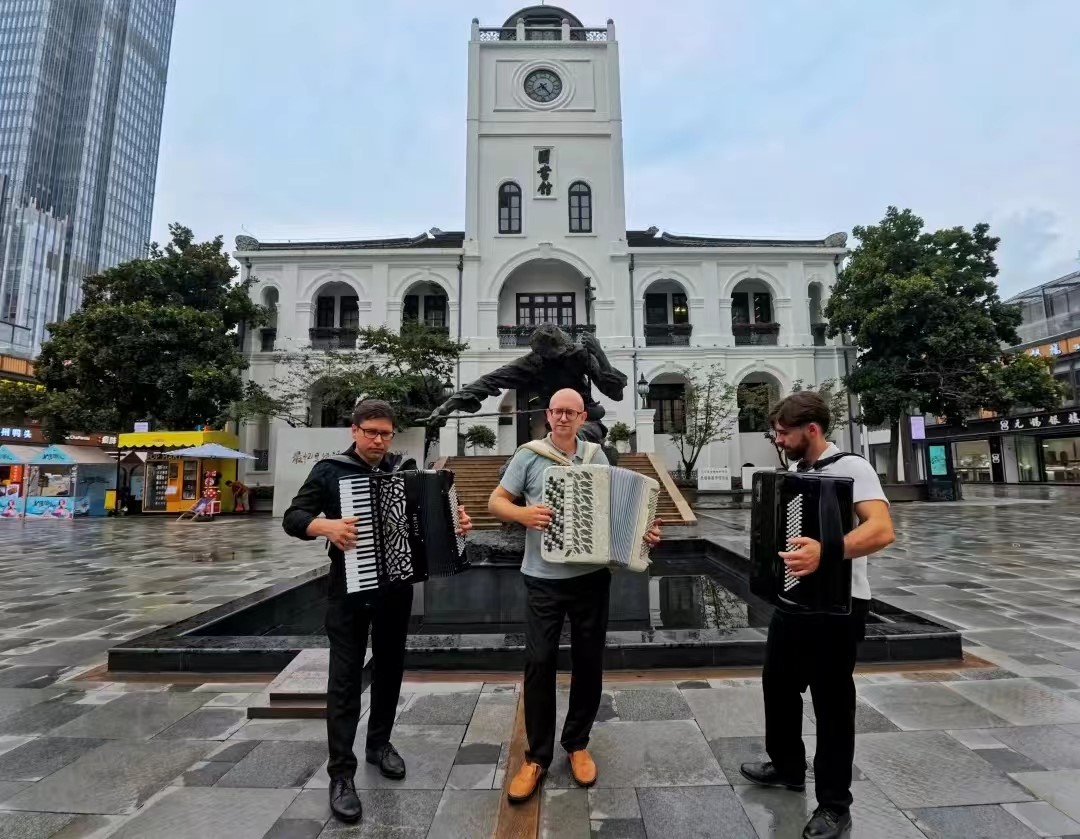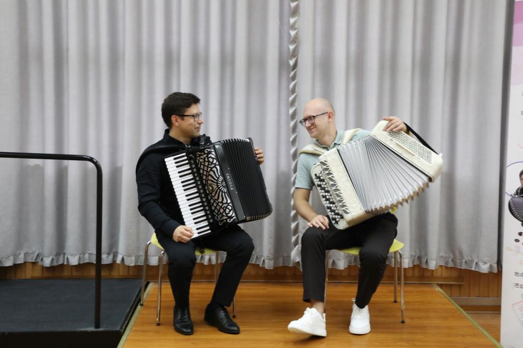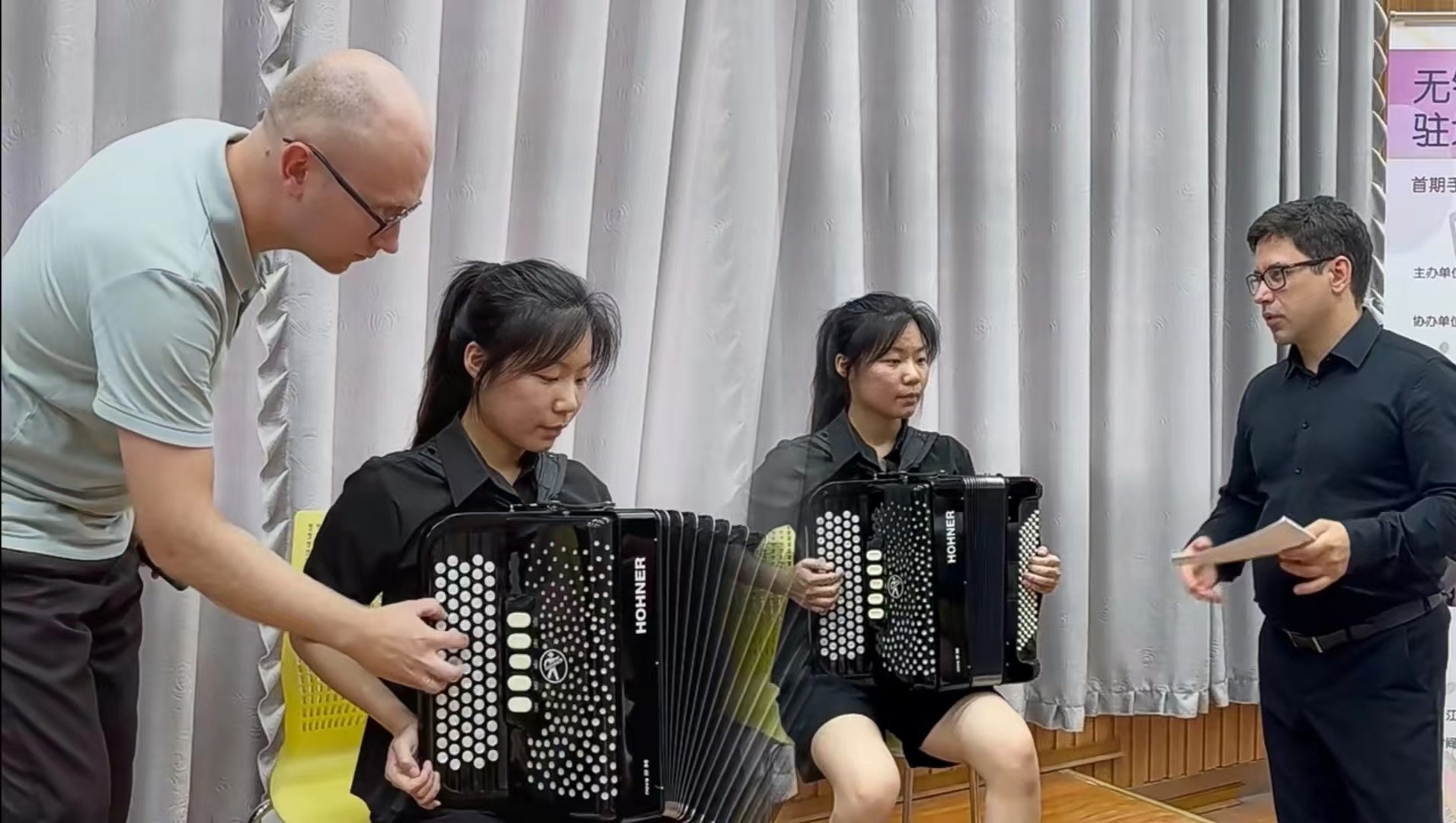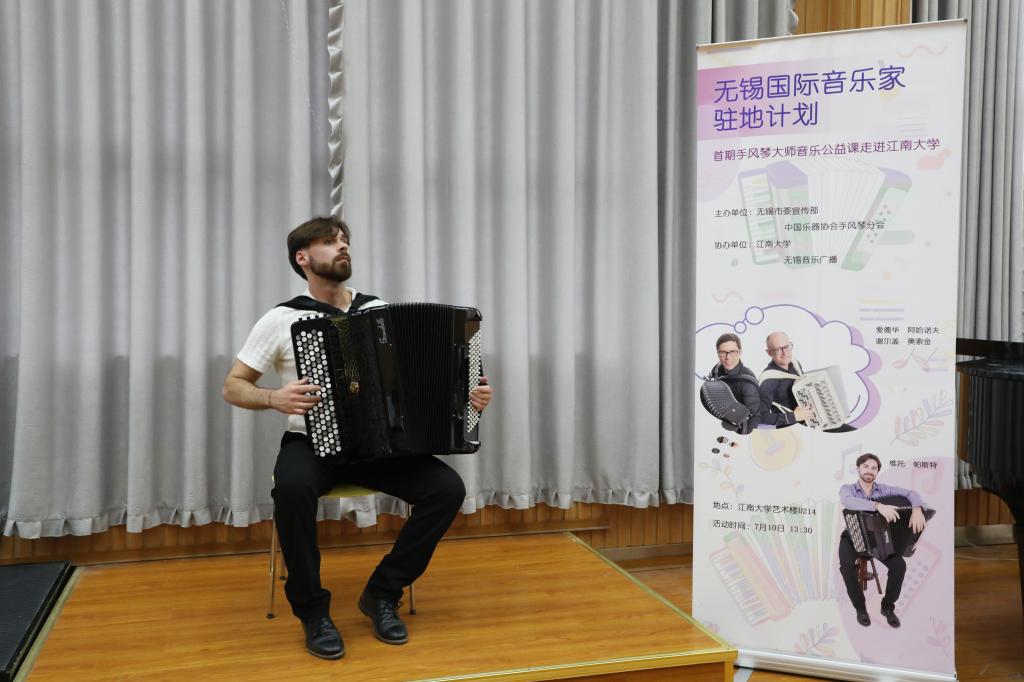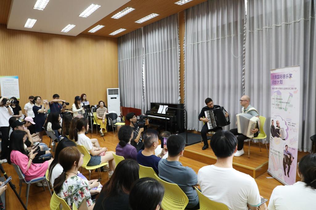 2024年7月10日下午13:30,无锡市委宣传部与中国乐器协会手风琴分会联合主办的无锡国际音乐家驻地计划——首期手风琴大师音乐公益课于BV伟德官方网站艺术楼D214成功举行。本次活动由BV伟德官方网站承办,特邀俄罗斯青年手风琴演奏家、作曲家爱德华•阿哈诺夫,莫斯科国立施尼特凯音乐学院教授谢尔盖•奥索金,以及葡萄牙青年才俊维托•帕斯特三位大师,共同为师生呈现了一场精彩绝伦的艺术展演与手风琴大师课。本次活动由BV伟德官方网站副院长王芳教授主持,中国音协手风琴学会副秘书长、上海师范大学音乐学院王从余教授亲临现场,与BV伟德官方网站音乐系50余名师生共同参与。