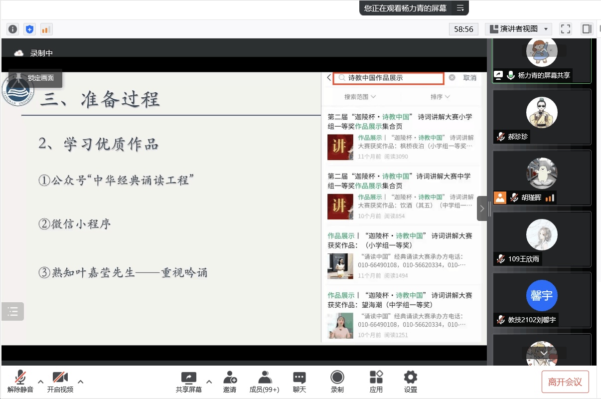 近日,BV伟德官方网站第十四期真人图书馆——中华经典诵写讲备赛经验分享会在线上顺利举行,会议邀请了在第三届中华经典诵写讲大赛“诗教中国”诗词讲解大赛中荣获一、二、三等奖的何明昭、杨力青、田佳平、陈蔚祺四位同学分享备赛经验,200余多名学生线上参加。