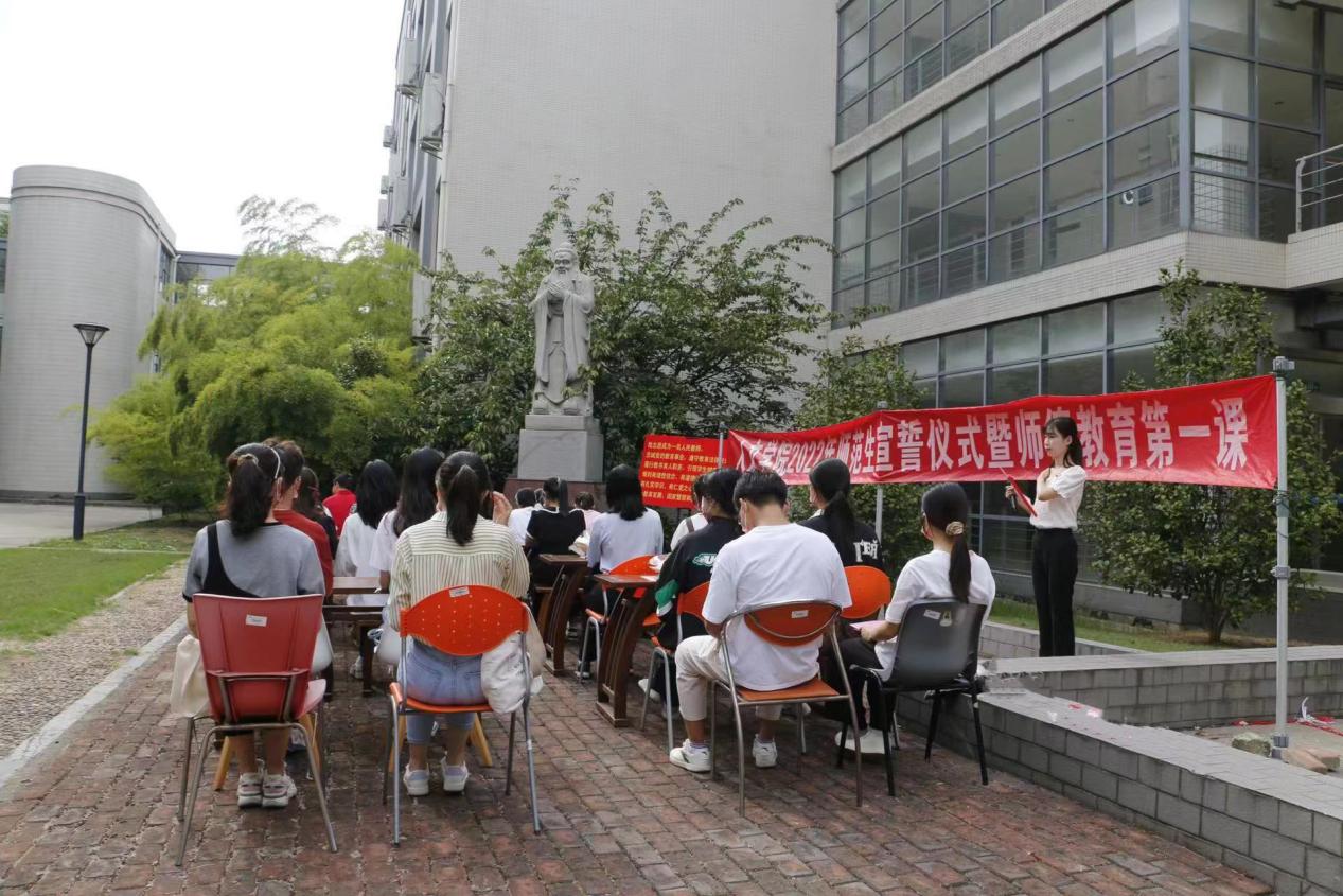为庆祝第三十八个教师节,进一步加强师德师风建设,增强师范生对教师职业的责任感与使命感。9月9日下午,BV伟德官方网站在第一教学楼北广场孔子像前隆重举行2022年师范生宣誓仪式暨师德教育第一课。BV伟德官方网站党委副书记、副院长李萍,BV伟德官方网站副院长于书娟,BV伟德官方网站田良臣教授和师范生新生代表共同参加了本次活动。由于疫情影响,活动采用“线上+线下”直播形式,联动全院全体师范生共同庆祝教师节这一光荣而神圣的节日。活动开始之前,师生一起观看了《习近平的教师情》专题篇。