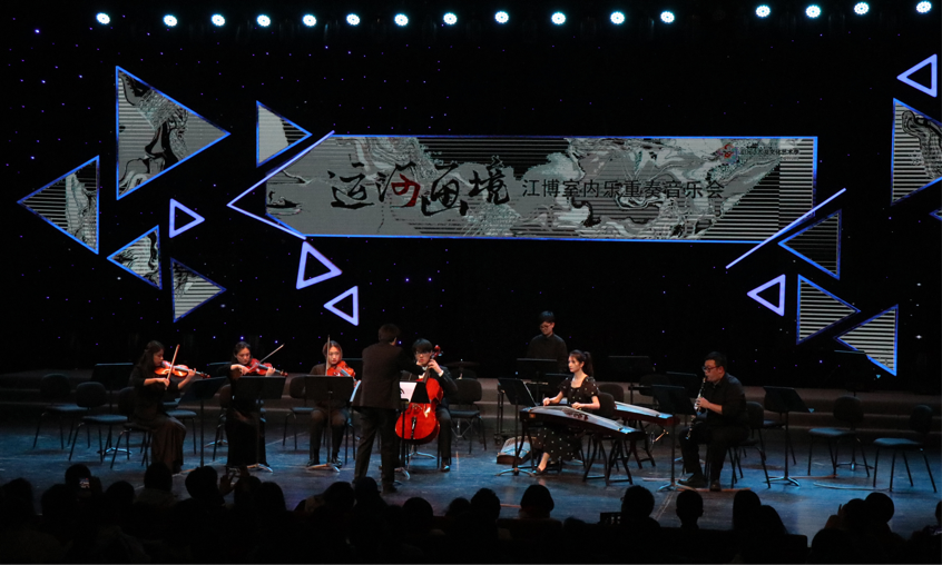 本场音乐会由三个部分组成,分别为弦乐四重奏作品、原创混合室内乐作品《运河画境》首演以及赵季平先生编曲的《唐诗歌曲八首(选段)》。弦乐四重奏部分由《唱支山歌给党听》、《两地曲》、《梁祝》、《北风吹》、《彩云追月》等11首中国各时期经典作品组成,用琴声引领观众回顾党的百年光辉历程。江博副教授创作的混合室内乐重奏作品《运河画境——为古筝、单簧管、弦乐四重奏与钢片琴而作》在当晚的音乐会上进行了首演。该作品以千百年来与江南民生息息相关的大运河文化为基底,通过江南民间音乐的素材使中国传统民族乐器与西洋管、弦、打击乐器相互交融,描绘了现代都市灵动、流利通畅之韵,凸显运河之画境。著名作曲家赵季平的《唐诗歌曲八首(选段)》由夏婉莹、武甜甜和何阳典三位音乐系的学生来演唱,作品融入了戏曲唱腔,旋律婉转、意境开阔,仿佛穿越时空,令人回味悠长。