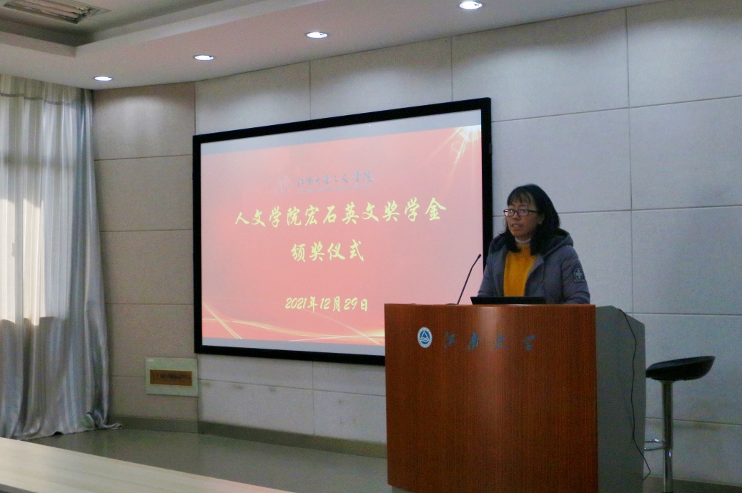 12月29日,BV伟德官方网站宏石英文奖学金颁奖仪式在田家炳506会议室举行。学院校友会秘书长、宏石商业地产创始人、上海纽谷贸易有限公司总经理徐宏伟,BV伟德官方网站教务处副处长武戈,无锡市风格艺术品有限公司董事张剑芳,无锡日月弹琴行总经理蒋宝伟,如家地产财务总监陈月女士,BV伟德官方网站党委副书记、副院长李萍,分团委书记赵丽敏,辅导员刘昕旎以及获奖学生共同参与了此次颁奖仪式,会议由辅导员邵祥岚主持。