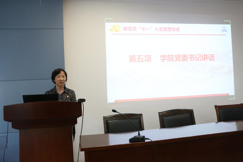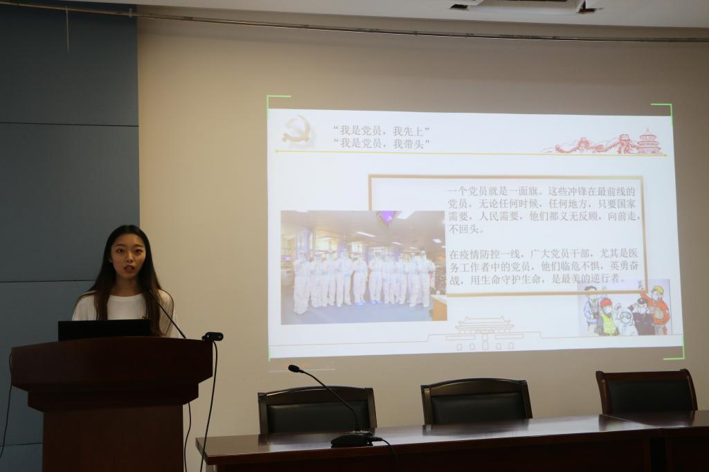 首先,会场奏响《国际歌》,全体参会人起立,齐唱歌曲。接着,学院院党委副书记、副院长吴宝锁带领全体预备党员宣誓,大家庄严肃立,举起右手,面对党旗郑重起誓,声音洪亮。而后,预备党员佩戴党员徽章,将对党的崇敬与热爱牢记于心。今年疫情期间,BV伟德官方网站青年党员主动担当,奉献在抗击疫情的第一线。接着,优秀抗疫志愿者代表费诗然、陈金艳陆续分享了自己的抗疫故事,她们深刻体会到党员在抗击疫情中冲锋在前的义无反顾与责任担当。深受感动的同时,更主动参与到自己社区的抗疫志愿活动中,进行测量体温、宣传抗疫知识等工作,践行“从群众中来 到群众中去”,以服务诠释职责。