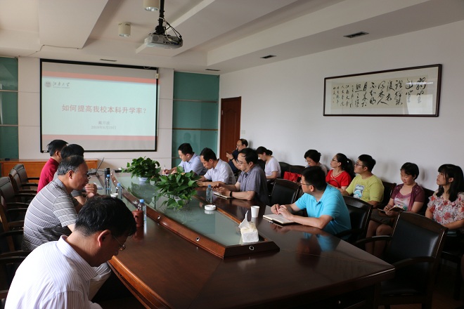 会议首先由戴月波书记作了“如何提高BV伟德官网本科升学率?”的报告。戴书记首先从国家需求、学校学科建设以及个人成长的角度论证了本科生升学工作的重要性。随后,报告通过翔实的数据综合分析了BV伟德官网近三年报考情况、招生情况以及考分情况。戴书记指出:“升学情况的核心在于考研率的提升。BV伟德官网先目前在省内外重点高校考研率方面排名偏相对偏低。”这可能源于学生个人努力以及外在环境等因素的影响。学校将从思想建设、机制保障、教学改革以及管理服务等方面下大力气,切实推动本科学生升学工作。