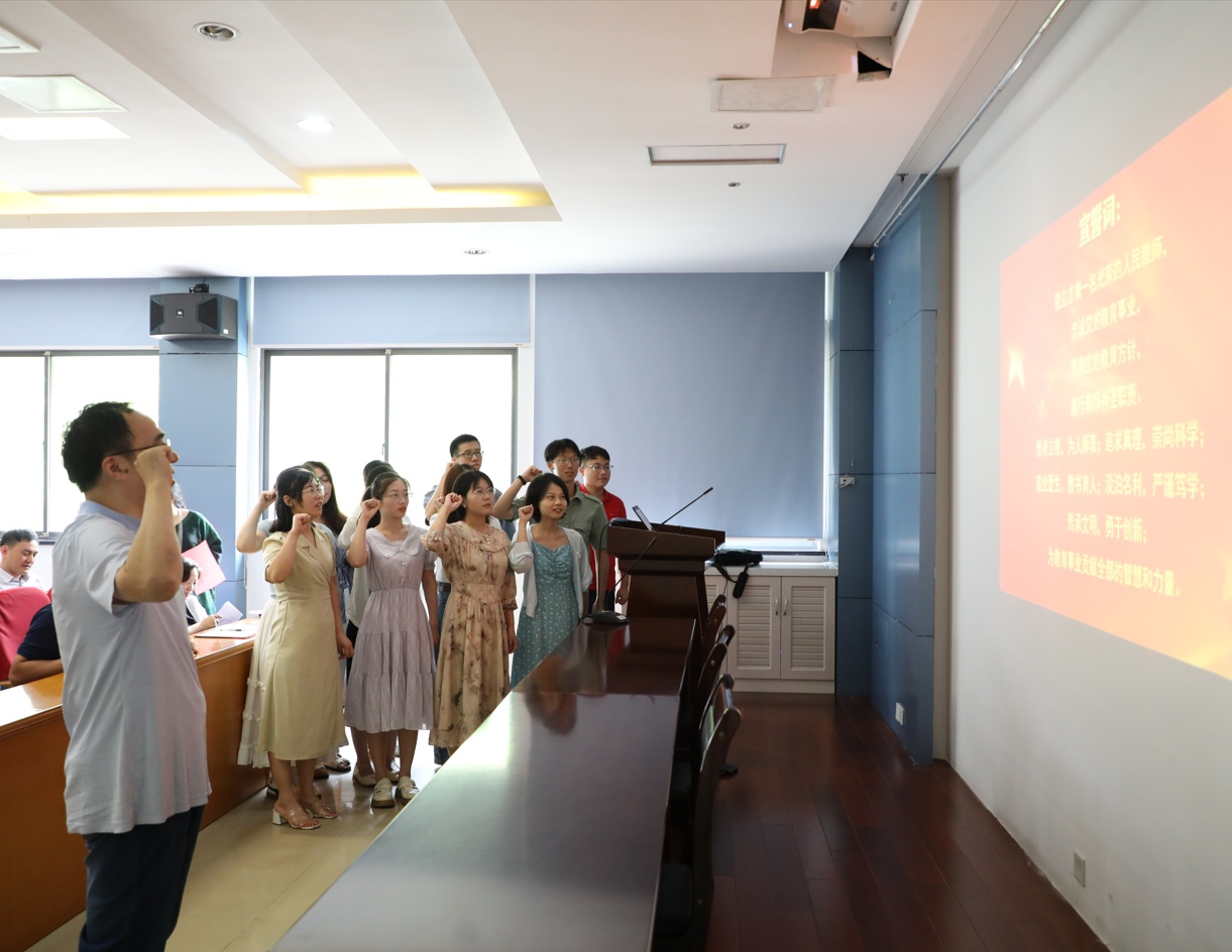 随后,学院今年新入职教师的12位青年教师发表了入职感言,对加入BV伟德官方网站大家庭表示感谢并表达了向老教师学习、努力实践教书育人理想的愿望。学院党委委员杨晖教授带领新教师进行入职宣誓。庄重而热烈的仪式让所有与会教师都深受感动与鼓舞,在BV伟德官方网站全体教职工的掌声中完成了新老教师“薪火相传 梦想延续”人文教育精神的传递。