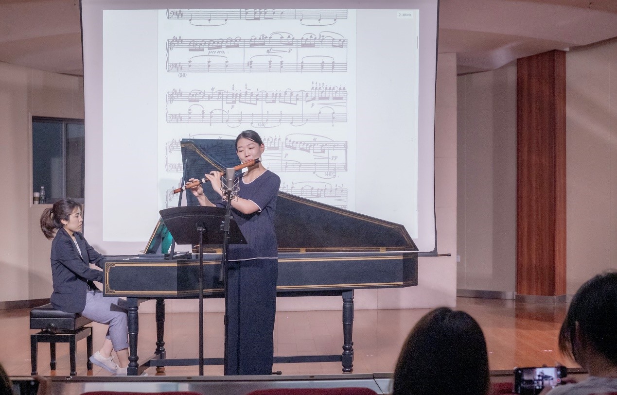 在音乐演奏环节中,两位演奏家通过展示曲目谱例和现场演奏,通过羽管键琴与古长笛的二重奏形式,演奏了J.S.巴赫《e小调奏鸣曲第三乐章》,泰勒曼《b小调奏鸣曲第一乐章》等典型的巴洛克曲目,生动地讲解了巴洛克时期音乐的特点。从节奏的韵律到旋律的走向,从和声的构成到调号所表达的情感,他们的讲解深入浅出,让听众们仿佛穿越时空,回到了那个充满艺术气息的巴洛克时代。听众们沉浸在那古朴而典雅的音乐氛围中,感受着巴洛克音乐的独特魅力。