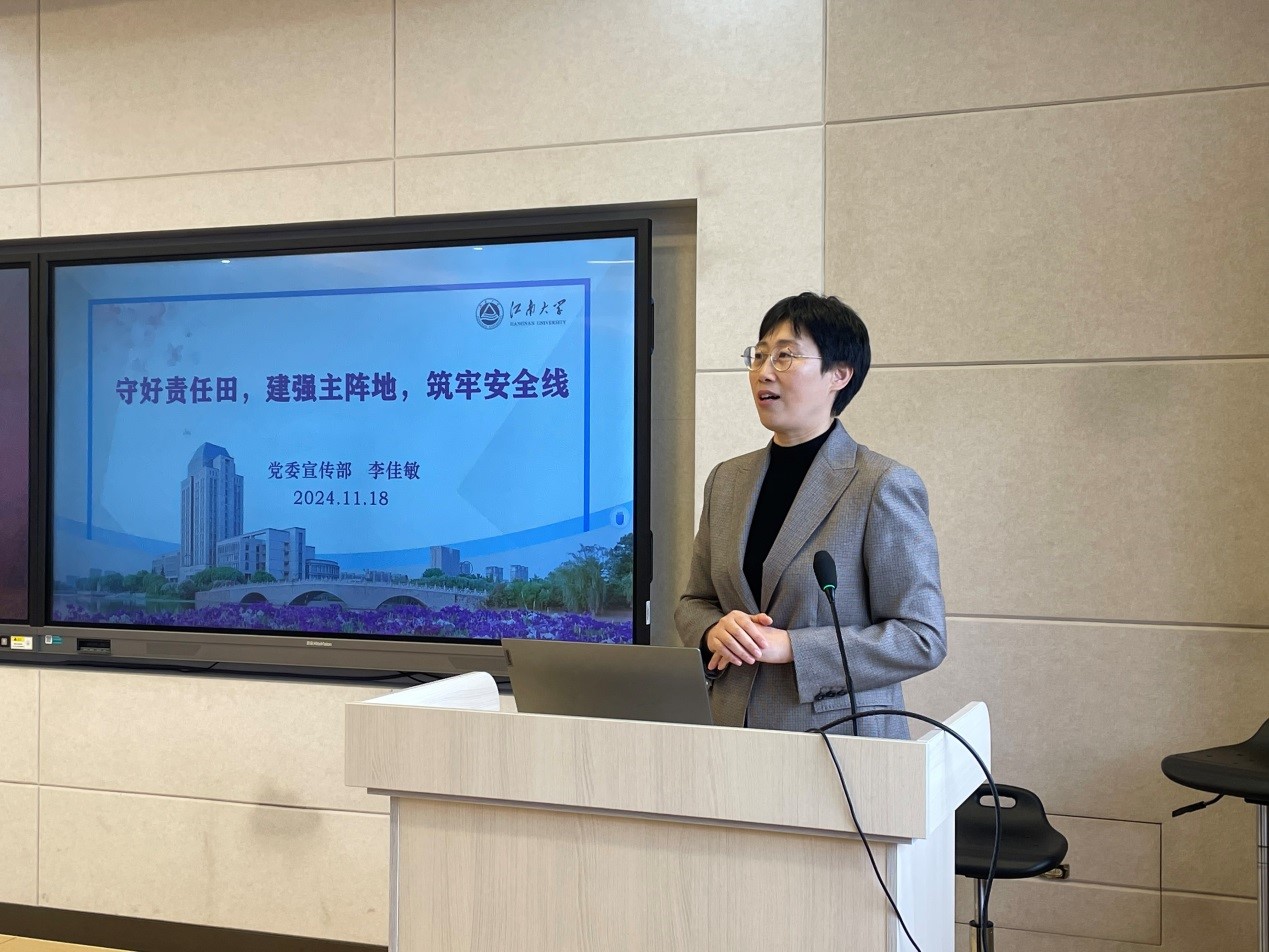 李佳敏以《守好责任田,建强主阵地,筑牢安全线》为题,分析了新时代新征程我国意识形态领域面临的基本形势及风险挑战,并从主体责任、主要阵地、主流氛围、主力队伍等四个方面提出做好高校意识形态工作的主要举措。她指出,意识形态工作是党的一项极端重要的工作。高校是意识形态斗争的前沿阵地,我们应坚持不懈用习近平新时代中国特色社会主义思想凝心铸魂,坚持和加强党的全面领导,守好“责任田”建强“主阵地”,巩固壮大奋进新时代的主流思想舆论,推进网络意识形态安全治理现代化,为全面建成教育强国凝聚强大的思政引领力。