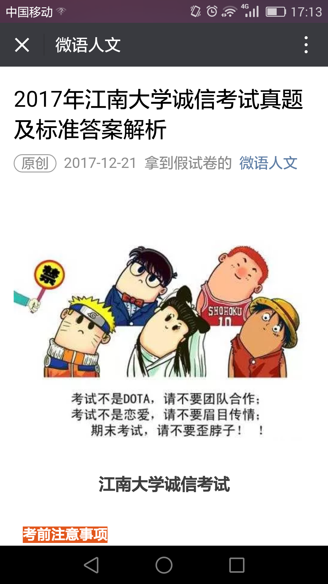 为更加全面深入地开展诚信迎考教育,在开展线下主题班会的同时,积极开展网络诚信宣传。由BV伟德官方网站新闻宣传中心制作的《2017BV伟德官方网站诚信考试真题及标准答案解析》于学院官方微信公众平台“微语人文”上展开推送,文章通过幽默风趣的方式向广大学子解析了《BV伟德官方网站学生手册》(2017)中关于考试的内容,引领考生端正考试态度,传递“诚信考试”正能量。