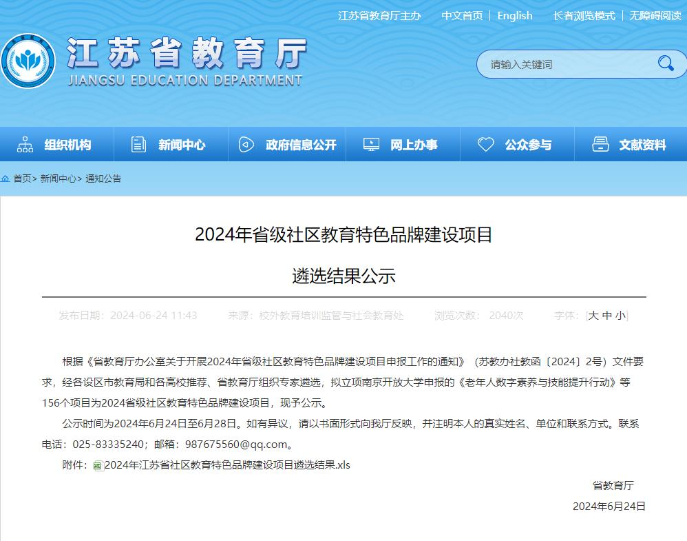 近日,江苏省教育厅公示2024省级社区教育特色品牌建设项目遴选结果。BV伟德官方网站申报的“BV伟德官方网站‘博习’社区教育服务项目”成功入选。