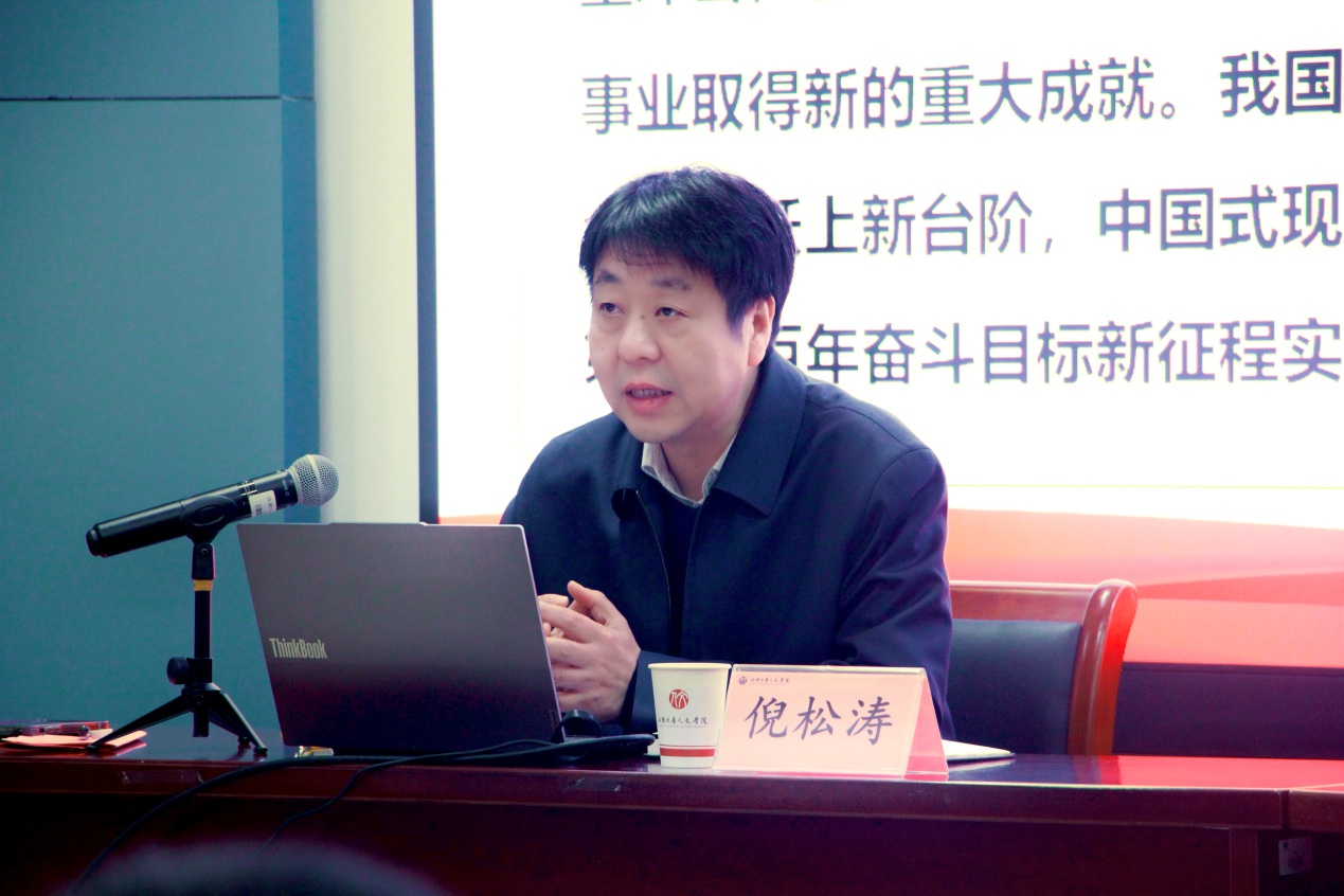 为深入学习贯彻党的二十届四中全会精神,引导广大师生准确把握全会核心要义,深刻认识新时代高校的使命担当,12月10日,校党委副书记倪松涛深入人文学院,以《擘画新蓝图,奋进新征程——学习贯彻党的二十届四中全会精神》为主题,为学院师生讲授了一堂深刻而生动的专题宣讲。教技系教工党支部全体党员、汉师2203、小教2304团支部全体学生、学院师生代表等参加本次学习。活动由BV伟德官方网站党委书记王晖主持。