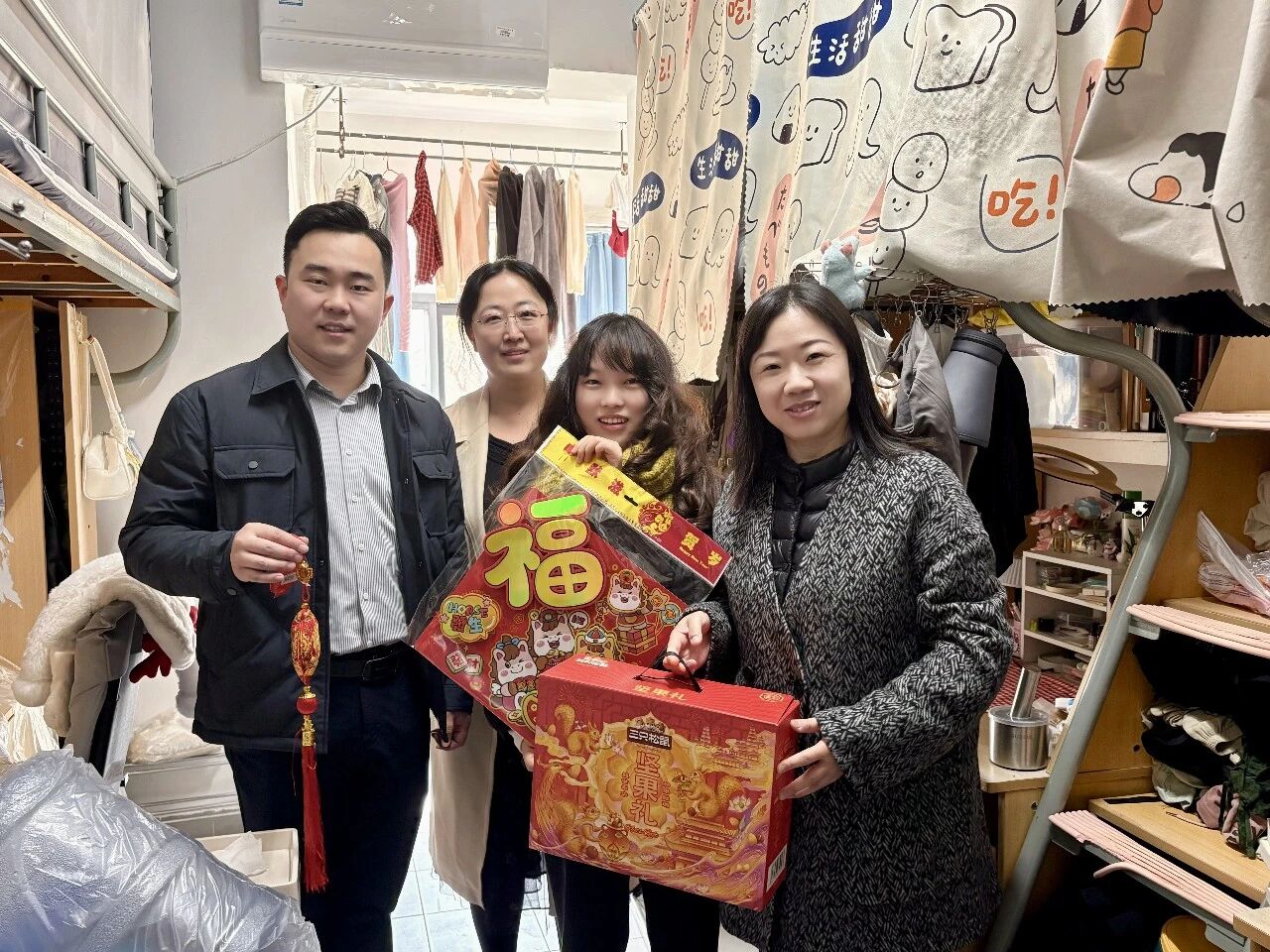 走进学生宿舍,王晖与留校学生亲切交谈,详细了解了大家的假期规划、学业进展及生活需求。针对学生关心的假期生活保障、校园服务等问题,现场逐一给予回应与解答。慰问过程中,学院领导为学子们送上了印有“福”字的新春礼包、坚果礼盒、牛奶等慰问品,将满满的新春祝福送到学生手中。同时,王晖叮嘱同学们,假期期间要时刻绷紧安全弦,注意宿舍用电安全、出行交通安全,远离各类安全隐患;生活上要规律作息、均衡饮食,做好自身健康防护,若遇到困难或突发情况,要第一时间联系辅导员和学院。她鼓励留校学子合理规划假期,在兼顾休息的同时利用好校园资源充实自我,度过一个平安、充实的春节。