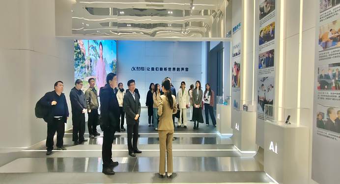 在科大讯飞总部,党员师生与科大讯飞教育技术研究院一行进行座谈交流。双方就学习贯彻两会精神,深化教育数字化战略部署展开了讨论,围绕“人工智能时代高校人才培养转型”“产学研协同育人模式”等议题展开热烈讨论。全体党员参观了人工智能展厅、讯飞人工智能产品展示,并直观感受科大讯飞在语音识别、教育辅助、智慧医疗和讯飞星火大模型人工智能领域的技术成果。