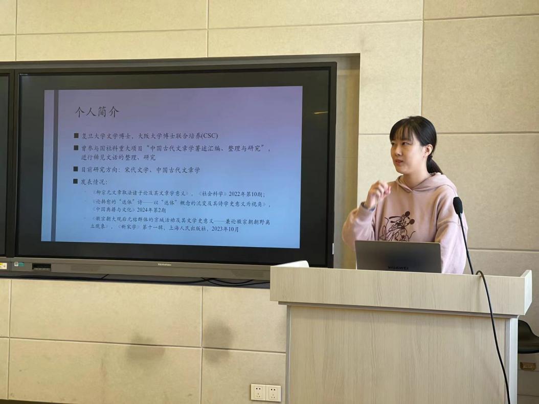 接着,中文系的刘雨晴副教授详细梳理了两宋之际的政治背景,特别是徽宗朝编订“元祐党籍”并对名列其中的“元祐党人”及其子弟、后学实施严厉限制政策的历史事件。她指出,这一时期“元祐党人”及其周边群体的生存处境、地域分布、仕宦情况以及文学书写等方面都发生了显著变化。随着朝廷政策的变动,这些群体的处境也经历了剧烈的动荡,但他们的文学书写却成为了两宋之际文学史的重要组成部分。刘雨晴副教授通过丰富的史料和深入的剖析,揭示了“元祐党人”及其子弟、后学在徽宗朝和高宗朝不同政策导向下的命运变迁。她特别强调了高宗朝“最爱元祐”的官方政策导向下,“元祐党人”普遍受到追复、尊崇,其子弟、后学也获得重用的历史现象。这一变化不仅反映了朝廷政策的转变,也体现了文学与政治之间的复杂关系。