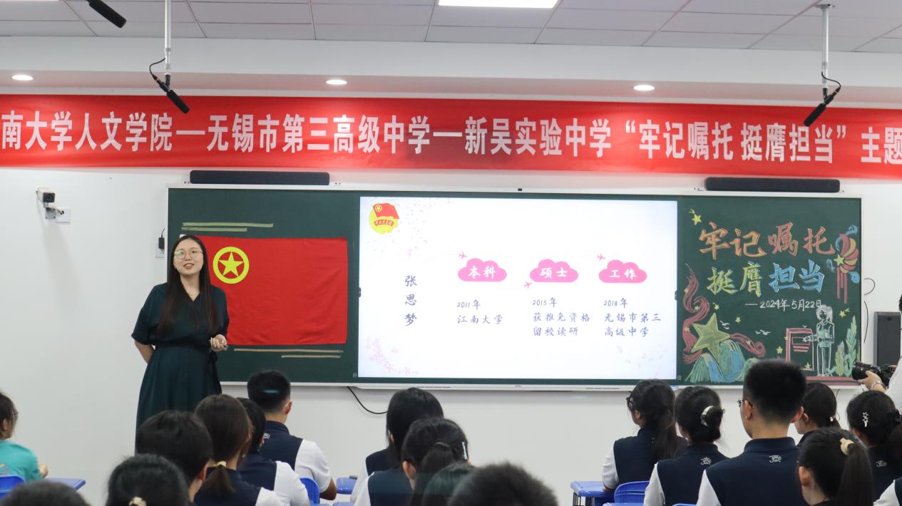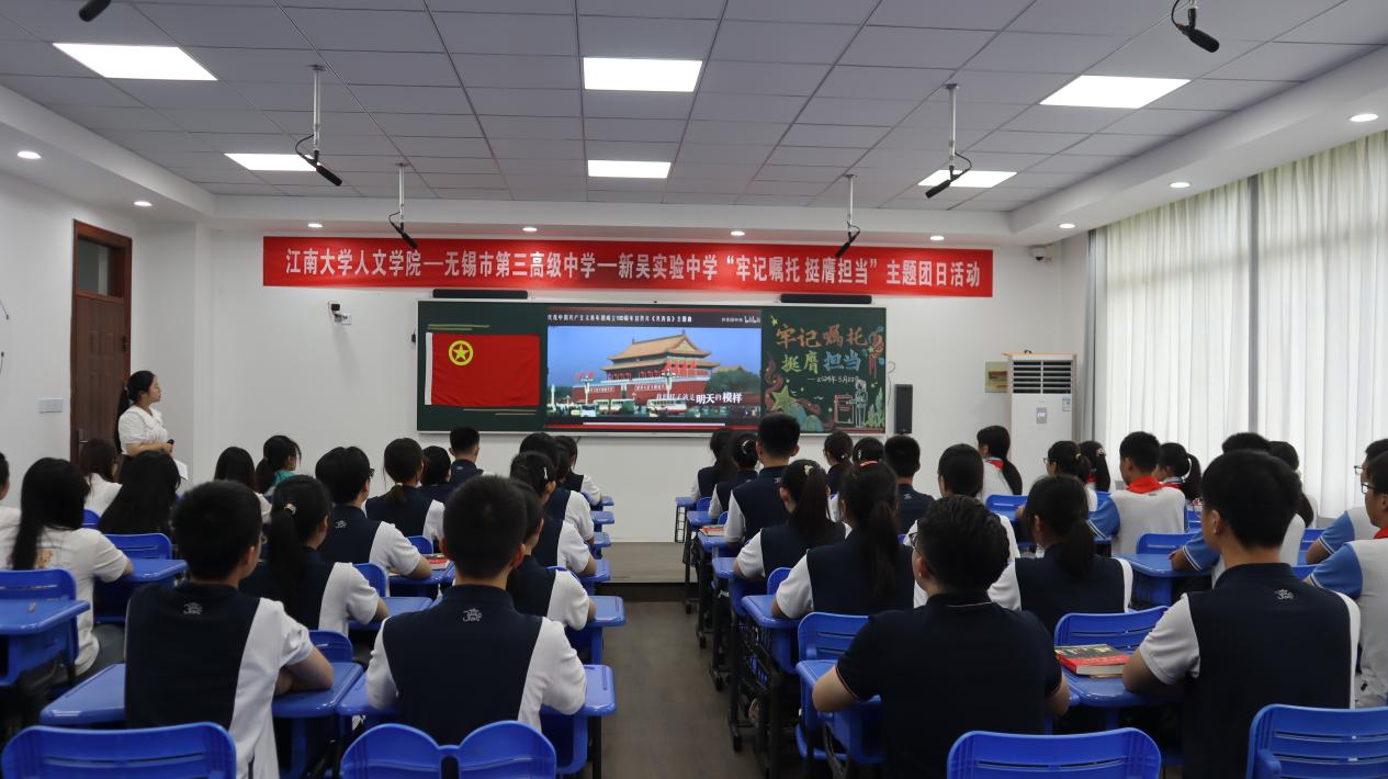 为深入学习习近平总书记五四重要寄语精神,近日,BV伟德官方网站青年马克思主义者培养工程第六届培训班学员赴无锡市第三高级中学参加“牢记嘱托、挺膺担当”主题团日活动,与无锡市第三高级中学、新吴实验中学的60余名团员代表们共同学习习近平总书记五四青年节对全国广大青年寄语精神,畅谈《习近平与大学生朋友们》读书心得,分享成长经历和感悟。
